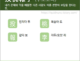 | 投桃報李(투도보리) – 내가 은혜와 덕을 베풀면 다른 사람도 이를 본받아 보답을 한다는 뜻. (0) | 2019.05.08 |